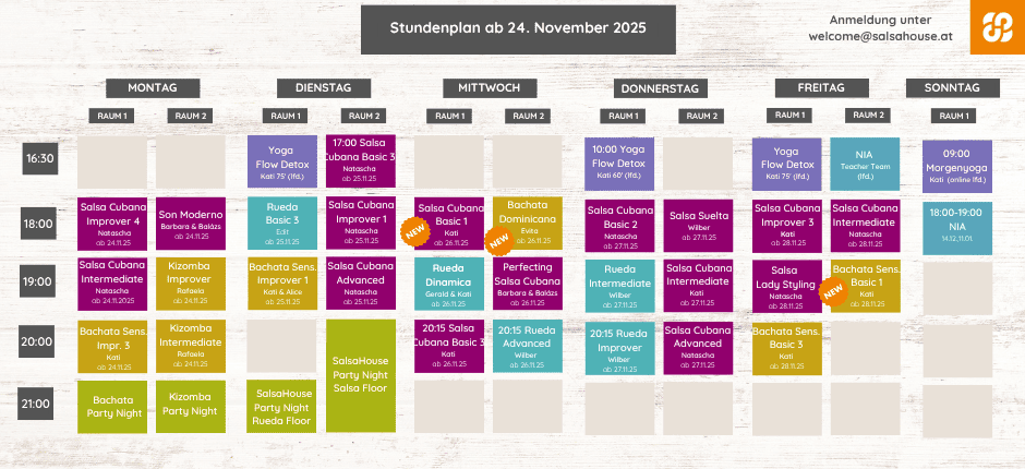 Finde deinen Kurs im Stundenplan und starte jetzt mit Tanzen lernen in Wien bei SalsaHouse. Wir freuen uns darauf, gemeinsam mit dir und deinen Freunden unvergessliche Tanzmomente zu erleben!